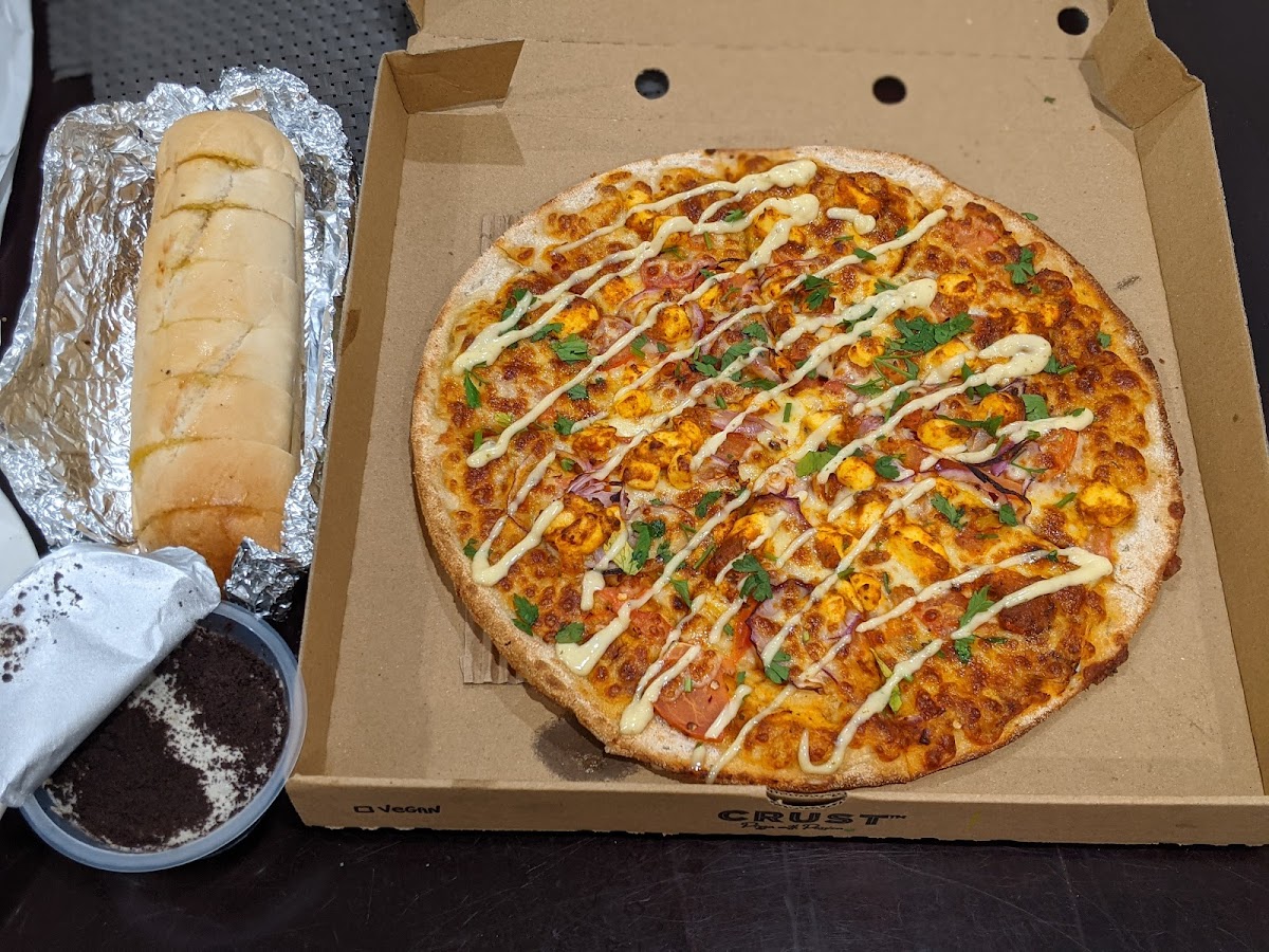 The restaurant’s signature dishes are a highlight for many patrons. The Crust Supreme is a must-try, loaded with fresh toppings and bursting with flavor. Fans of tropical tastes will love the Hawaiian Pizza, while those seeking a twist on Indian flavors can’t miss the Paneer Masala Pizza. For those who like a mix, the Half and Half option lets you enjoy two different flavors in one pizza. To round out the meal, the Garlic Bread and indulgent Cookies and Cream Mousse are perfect additions, making every visit a treat from start to finish.